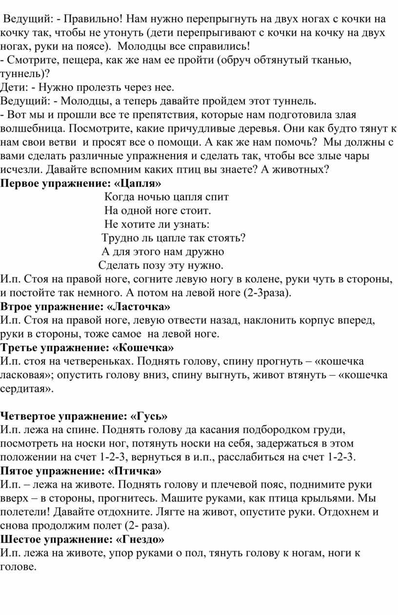 Ведущий: - Правильно! Нам нужно перепрыгнуть на двух ногах с кочки на кочку так, чтобы не утонуть (дети перепрыгивают с кочки на кочку на двух ногах, руки на поясе). Молодцы все справились!