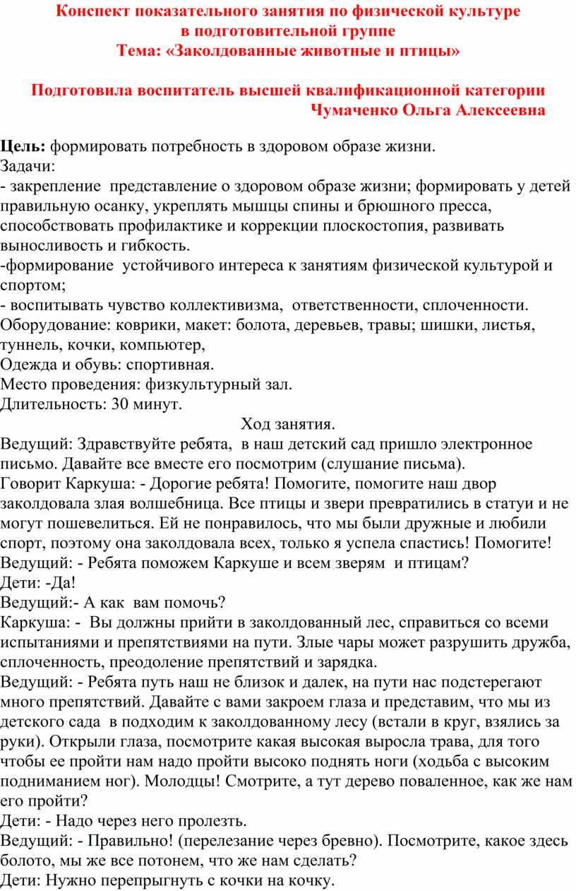 Говорит Каркуша: - Дорогие ребята! Помогите, помогите наш двор заколдовала злая волшебница. Все птицы и звери превратились в статуи и не могут пошевелиться. Ей не понравилось, что мы были дружные и любили спорт, поэтому она заколдовала всех, только я успела спастись! Помогите!