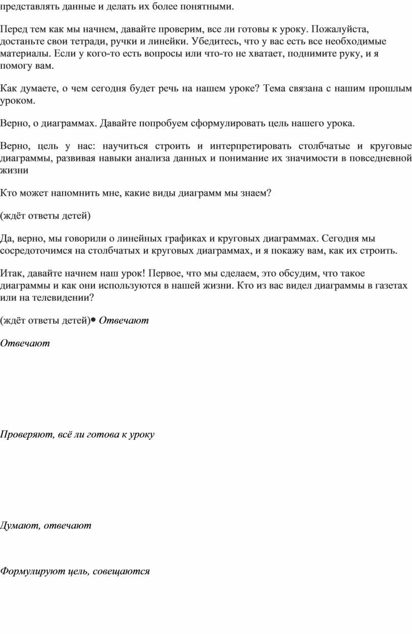 Доброе утро, ребята! Я рада видеть вас на нашем уроке математики. Сегодня мы будем изучать очень интересную тему — построение столбчатых и круговых диаграмм. Эти диаграммы помогают нам визуально представлять данные и делать их более понятными. Перед тем как мы начнем, давайте проверим, все ли готовы к уроку. Пожалуйста, достаньте свои тетради, ручки и линейки. Убедитесь, что у вас есть все необходимые материалы. Если у кого-то есть вопросы или что-то не хватает, поднимите руку, и я помогу вам. Как думаете, о чем сегодня будет речь на нашем уроке? Тема связана с нашим прошлым уроком. Верно, о диаграммах. Давайте попробуем сформулировать цель нашего урока. Верно, цель у нас: научиться строить и интерпретировать столбчатые и круговые диаграммы, развивая навыки анализа данных и понимание их значимости в повседневной жизни Кто может напомнить мне, какие виды диаграмм мы знаем? (ждёт ответы детей) Да, верно, мы говорили о линейных графиках и круговых диаграммах. Сегодня мы сосредоточимся на столбчатых и круговых диаграммах, и я покажу вам, как их строить. Итак, давайте начнем наш урок! Первое, что мы сделаем, это обсудим, что такое диаграммы и как они используются в нашей жизни. Кто из вас видел диаграммы в газетах или на телевидении? (ждёт ответы детей) |