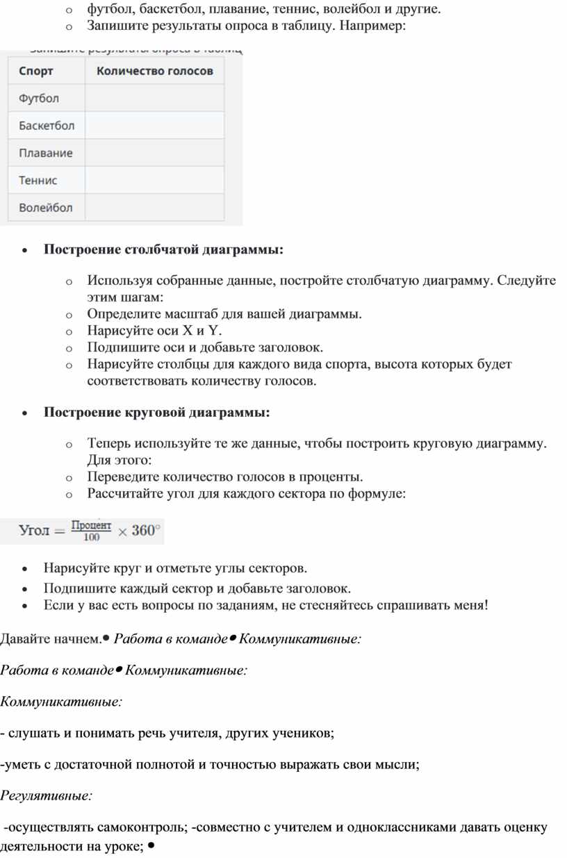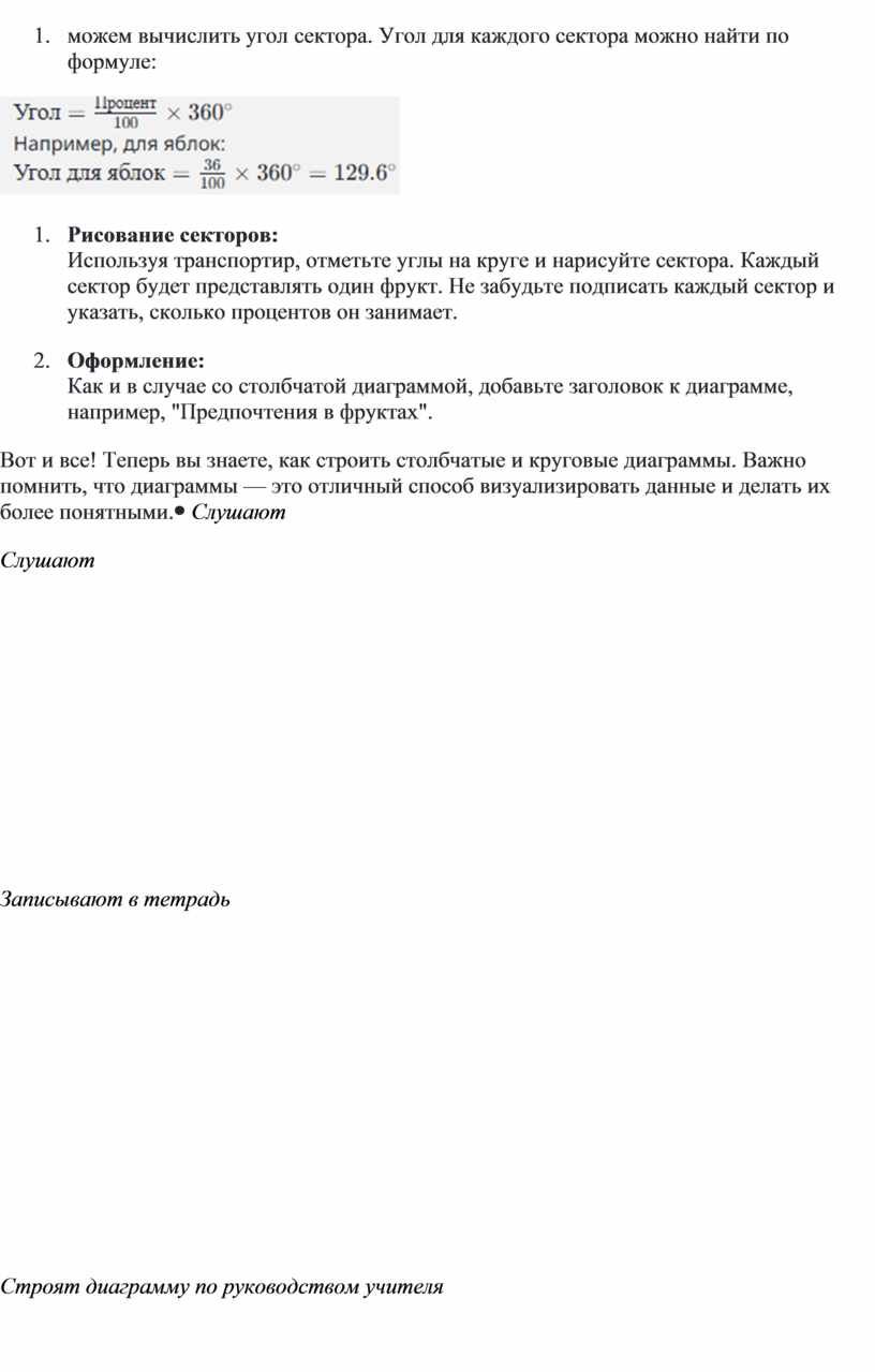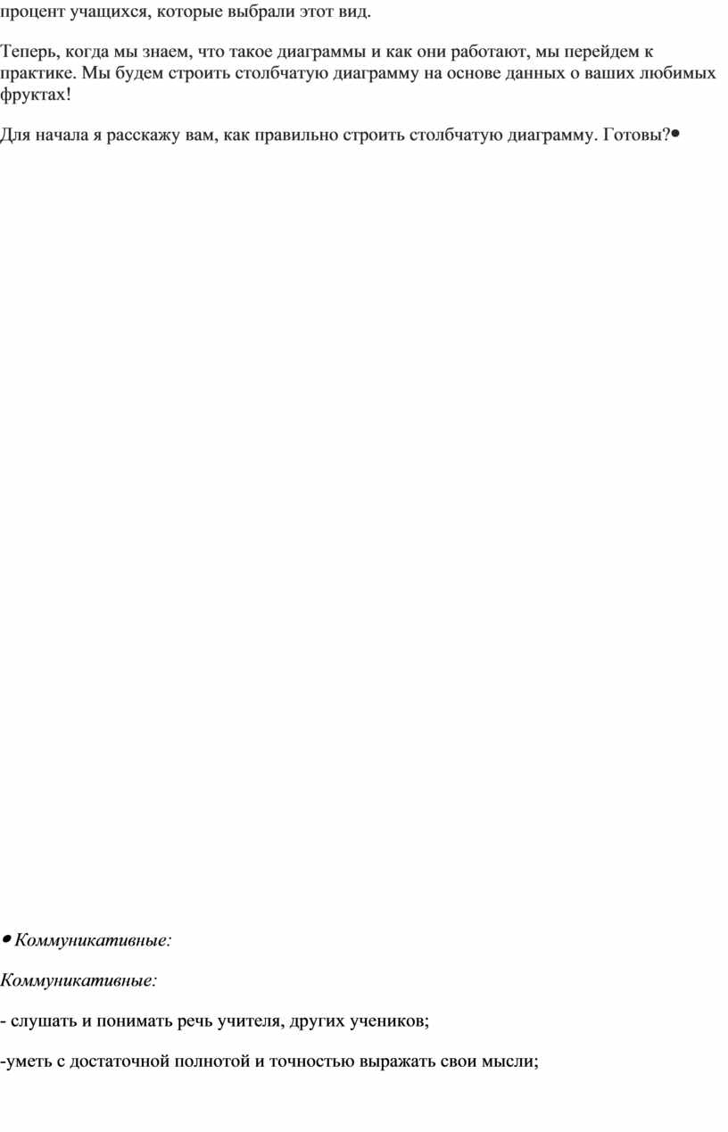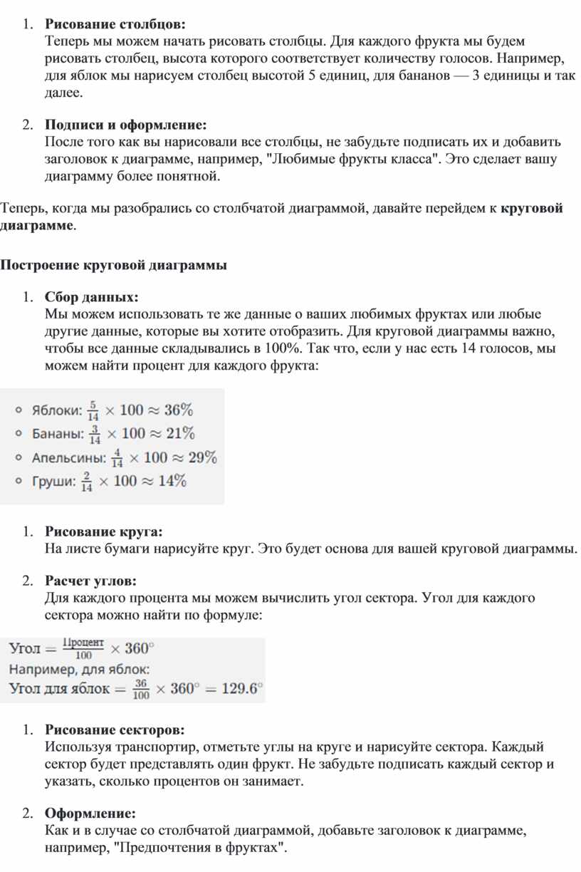 Диаграммы — это наглядные способы представления данных. Они помогают нам быстро и легко воспринимать информацию, сравнивать разные величины и делать выводы. Например, когда вы видите диаграмму с любимыми фруктами вашего класса, вы можете сразу понять, какой фрукт предпочитают больше всего. Теперь давайте подумаем, где мы можем встретить диаграммы в повседневной жизни. Кто из вас видел диаграммы в газетах, журналах или на телевидении? Поделитесь, пожалуйста, своими наблюдениями! (ждет ответов от учеников) Отлично! Да, диаграммы часто используются в новостях, чтобы показать статистику, в отчетах о здоровье, чтобы проиллюстрировать данные о заболеваниях, или даже в бизнесе для анализа продаж. Они делают информацию более доступной и понятной. Теперь давайте поговорим о разных типах диаграмм. Мы сосредоточимся на двух основных видах: столбчатых и круговых диаграммах. Столбчатая диаграмма — это график, который показывает данные в виде вертикальных или горизонтальных столбцов. Каждый столбец представляет собой определенную категорию, а высота или длина столбца показывает величину этой категории. Например, если мы посмотрим на столбчатую диаграмму с данными о любимых фруктах, каждый столбец будет представлять один фрукт, а высота столбца — это количество голосов за этот фрукт. Круговая диаграмма — это круг, разделенный на сектора, где каждый сектор показывает долю части от целого. Например, если мы хотим показать, как распределяются предпочтения в спорте среди класса, каждый сектор будет представлять один вид спорта, а его размер — это процент учащихся, которые выбрали этот вид. Теперь, когда мы знаем, что такое диаграммы и как они работают, мы перейдем к практике. Мы будем строить столбчатую диаграмму на основе данных о ваших любимых фруктах! Для начала я расскажу вам, как правильно строить столбчатую диаграмму. Готовы? |