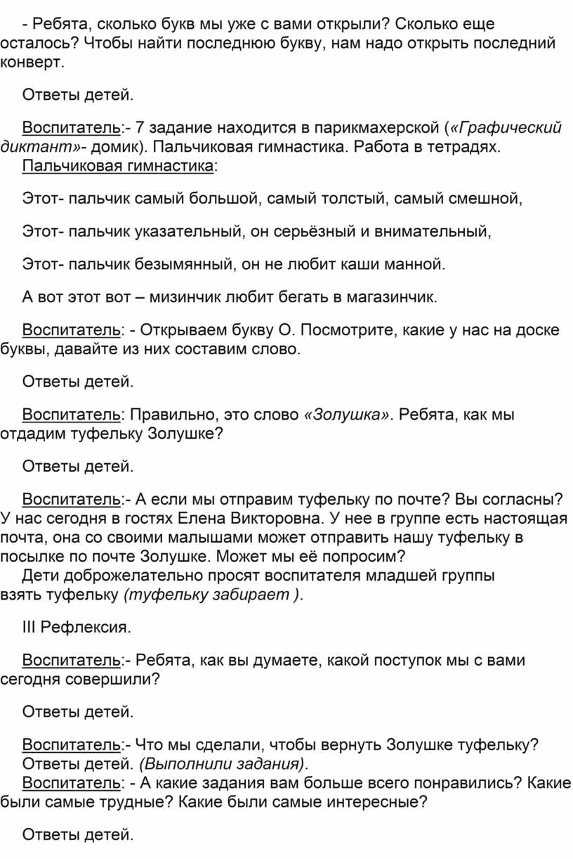Воспитатель:- Здесь написано, что если мы выполним все задания, то сразу отгадаем имя хозяйки, которой принадлежит эта туфелька. В каждом задании лежит буква, выполняя их, мы открываем букву и по буквам составляем слово. Это слово и есть имя хозяйки туфельки.