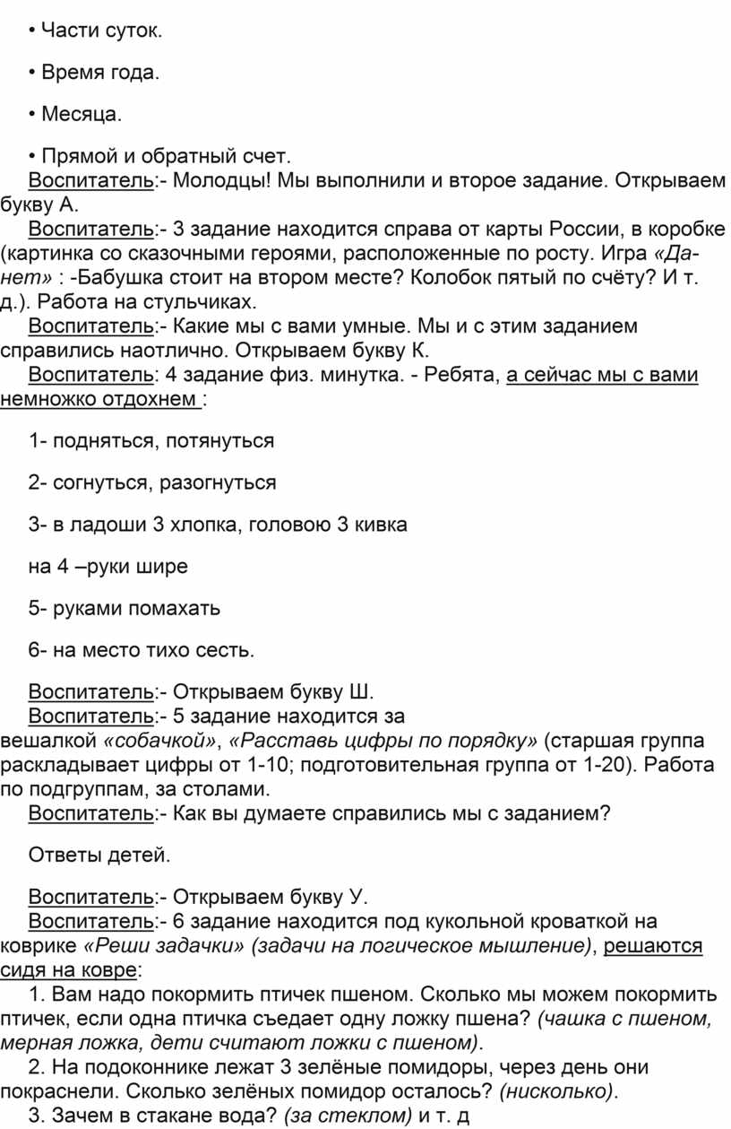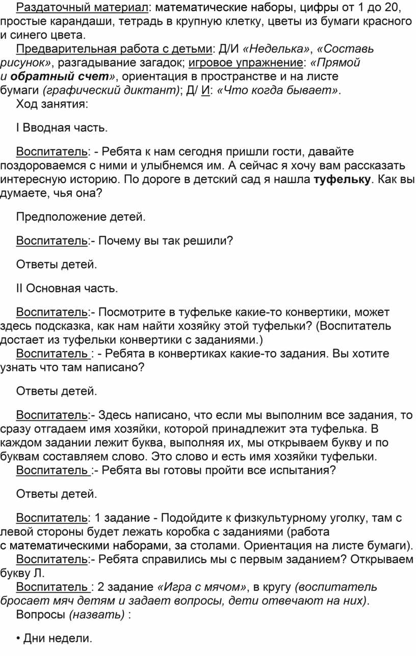Предварительная работа с детьми: Д/И «Неделька», «Составь рисунок», разгадывание загадок; игровое упражнение: «Прямой и обратный счет», ориентация в пространстве и на листе бумаги (графический диктант); Д/ И: «Что когда бывает».