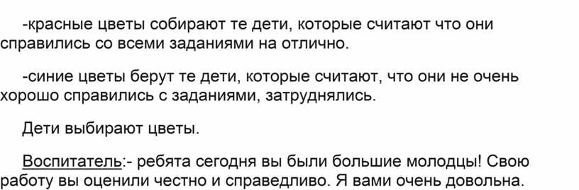 Воспитатель:- ребята сегодня вы были большие молодцы! Свою работу вы оценили честно и справедливо. Я вами очень довольна.