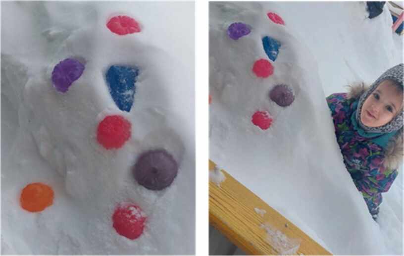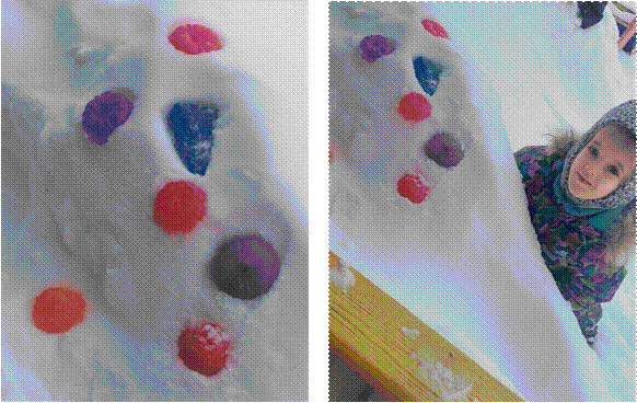 Дети под руководством воспитателя составляют алгоритм действий изготовления ледяных игрушек: взять форму, опустить в нее сложенную вдвое нить (это будет подвеска – дом сосульки), подкрасить воду акварелью, залить приготовленные формочки, вынести в холодное место. После замерзания воды сосульку освобождают и украшают участок.