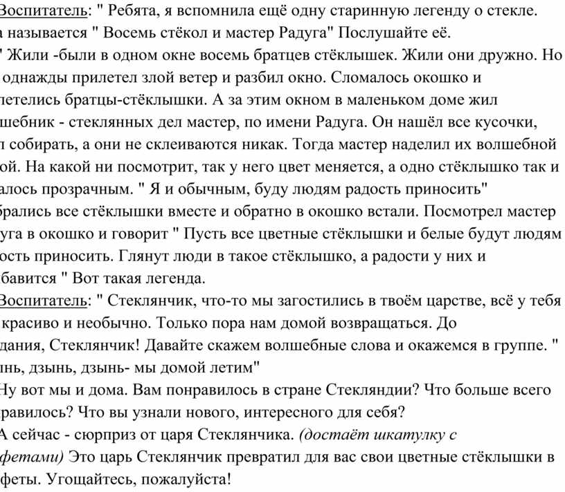 Воспитатель: " Ребята, я вспомнила ещё одну старинную легенду о стекле. Она называется " Восемь стёкол и мастер Радуга" Послушайте её.