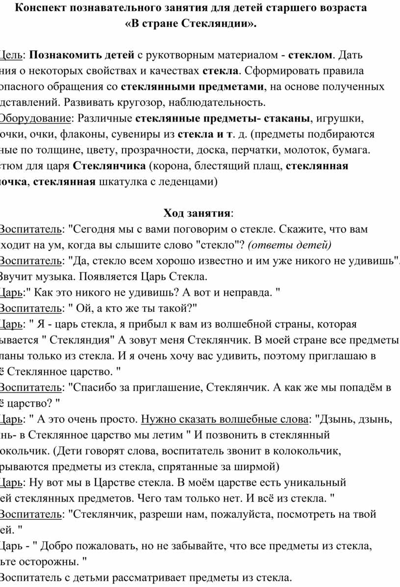 1.1 Конспект познавательного занятия для детей старшего возраста «В стране Стекляндии».