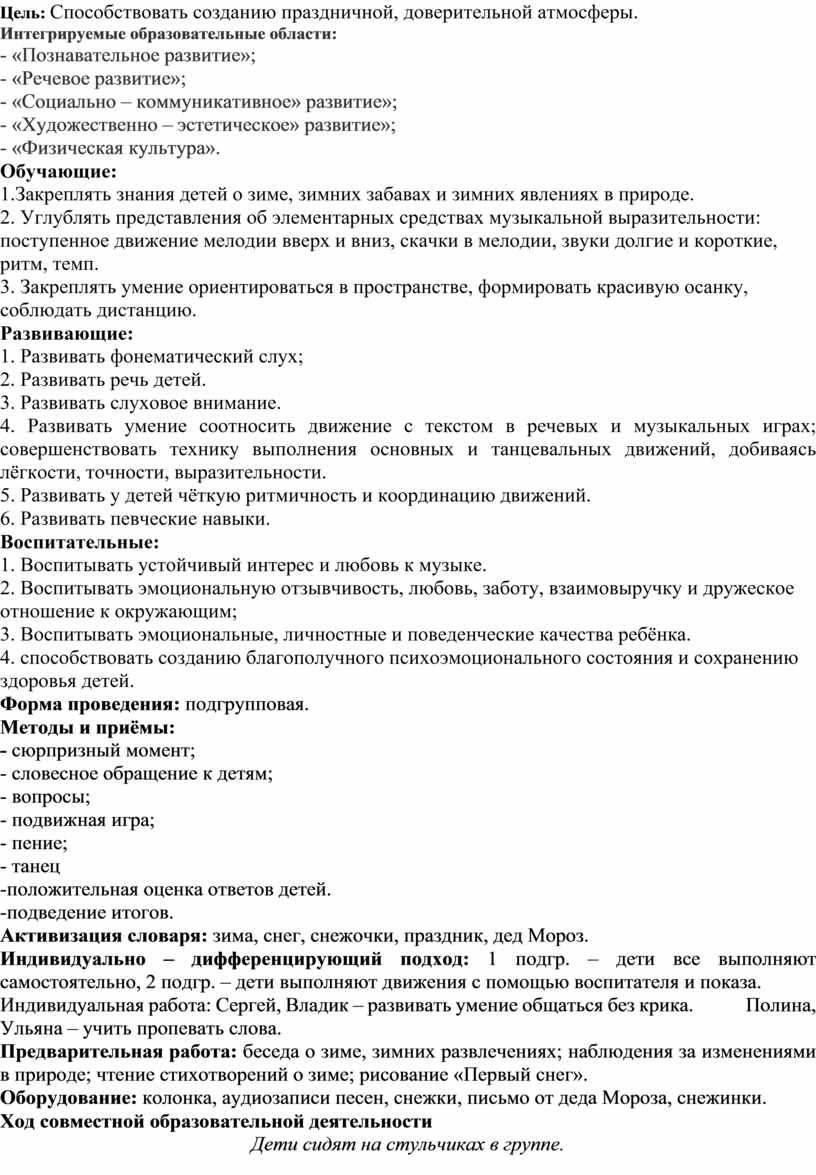 Предварительная работа: беседа о зиме, зимних развлечениях; наблюдения за изменениями в природе; чтение стихотворений о зиме; рисование «Первый снег».
