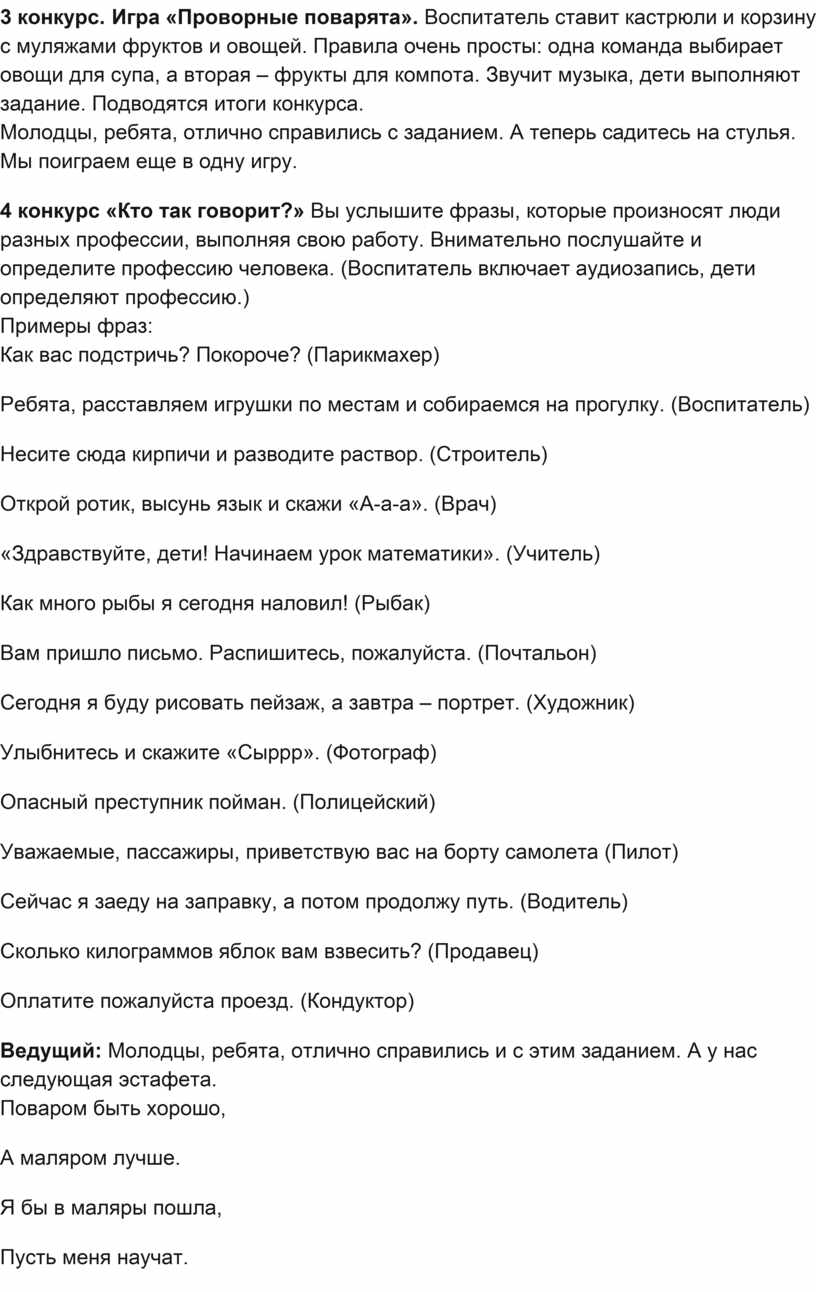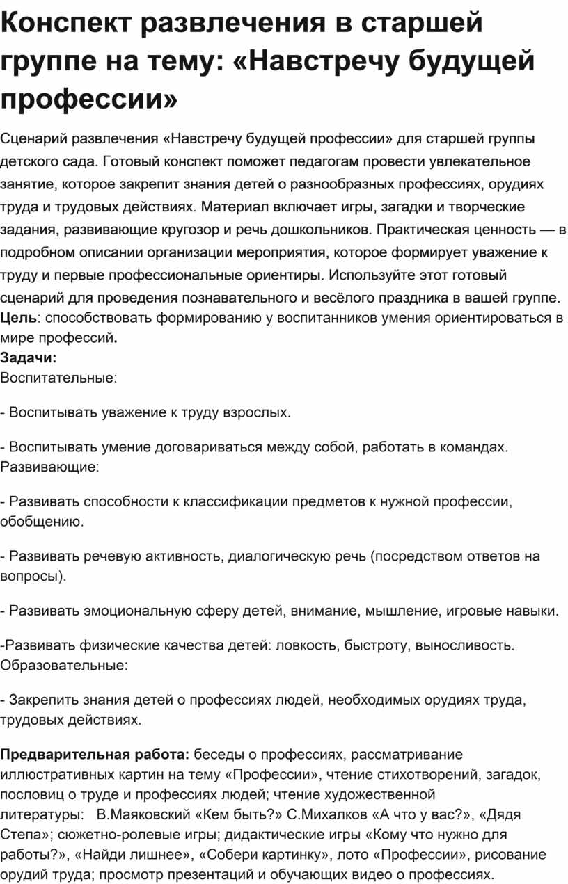 Сценарий развлечения «Навстречу будущей профессии» для старшей группы детского сада. Готовый конспект поможет педагогам провести увлекательное занятие, которое закрепит знания детей о разнообразных профессиях, орудиях труда и трудовых действиях. Материал включает игры, загадки и творческие задания, развивающие кругозор и речь дошкольников. Практическая ценность — в подробном описании организации мероприятия, которое формирует уважение к труду и первые профессиональные ориентиры. Используйте этот готовый сценарий для проведения познавательного и весёлого праздника в вашей группе.