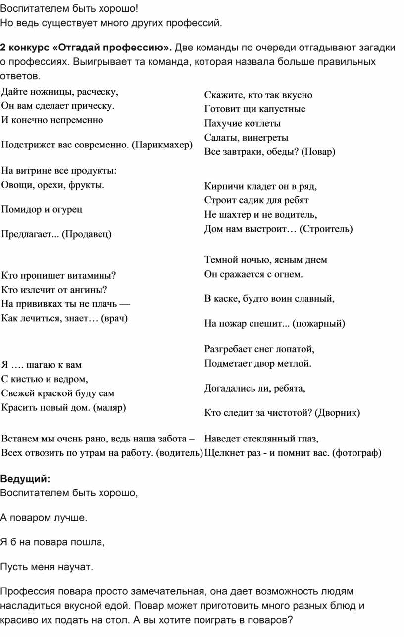 2 конкурс «Отгадай профессию». Две команды по очереди отгадывают загадки о профессиях. Выигрывает та команда, которая назвала больше правильных ответов.