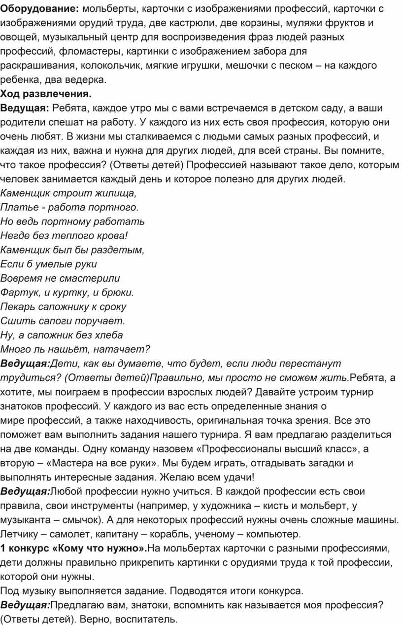Ведущая: Ребята, каждое утро мы с вами встречаемся в детском саду, а ваши родители спешат на работу. У каждого из них есть своя профессия, которую они очень любят. В жизни мы сталкиваемся с людьми самых разных профессий, и каждая из них, важна и нужна для других людей, для всей страны. Вы помните, что такое профессия? (Ответы детей) Профессией называют такое дело, которым человек занимается каждый день и которое полезно для других людей.