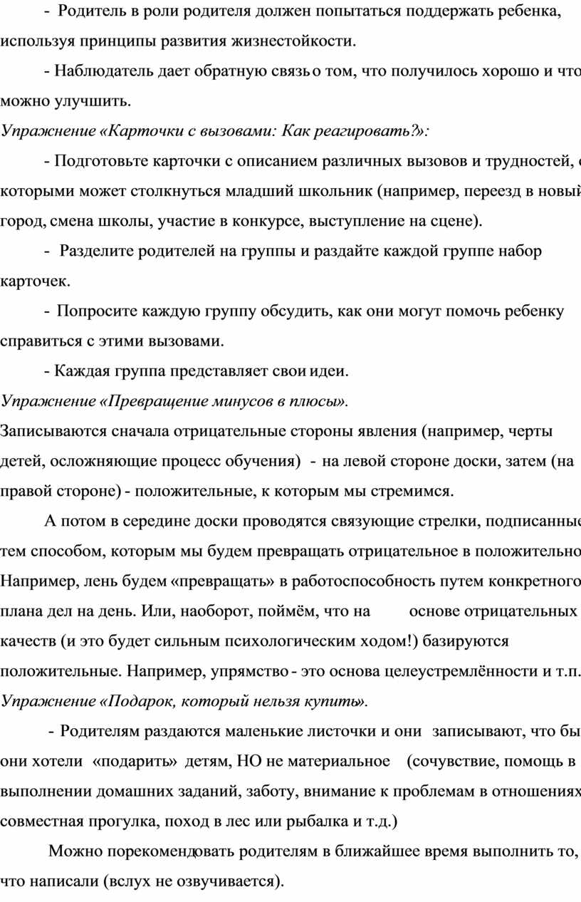 Цель собрания: познакомить родителей с понятием жизнестойкости, ее компонентами, способами формирования и развития у детей младшего школьного возраста, а также подчеркнуть роль родительского примера в этом процессе.