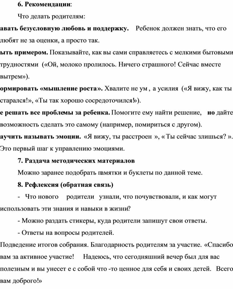 - Подведение итогов собрания. Благодарность родителям за участие. «Спасибо вам за активное участие! Надеюсь, что сегодняшний вечер был для вас полезным и вы унесете с собой что-то ценное для себя и своих детей. Всего вам доброго!»