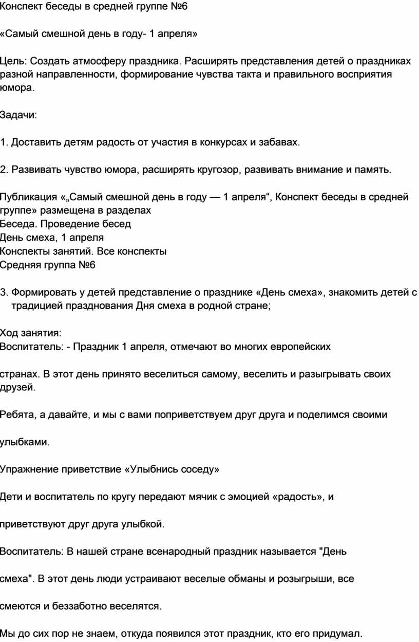 Публикация «„Самый смешной день в году — 1 апреля“, Конспект беседы в средней группе» размещена в разделах