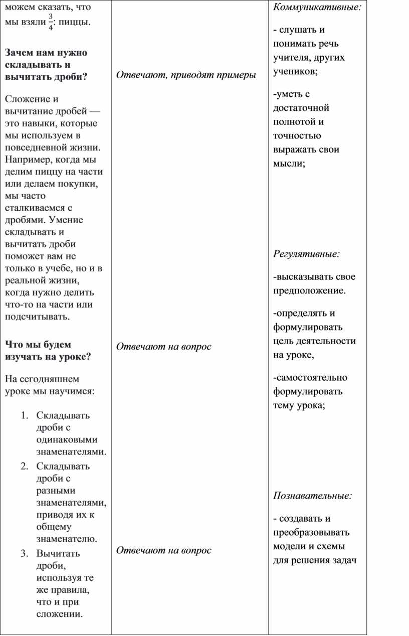 Цель урока: научить учащихся складывать и вычитать дроби с одинаковыми и разными знаменателями, а также развить навыки работы с дробями через практические задания и обсуждения.