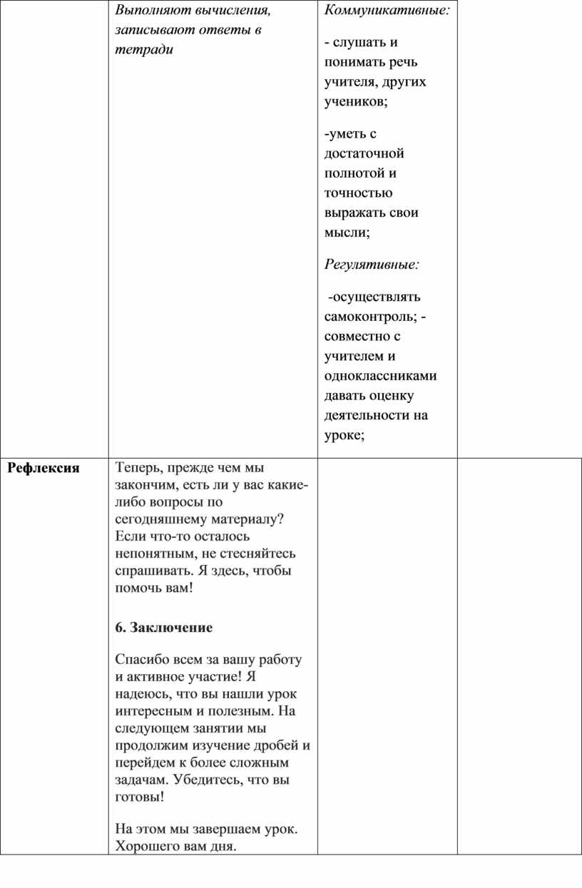 Теперь, прежде чем мы закончим, есть ли у вас какие-либо вопросы по сегодняшнему материалу? Если что-то осталось непонятным, не стесняйтесь спрашивать. Я здесь, чтобы помочь вам! 6. ЗаключениеСпасибо всем за вашу работу и активное участие! Я надеюсь, что вы нашли урок интересным и полезным. На следующем занятии мы продолжим изучение дробей и перейдем к более сложным задачам. Убедитесь, что вы готовы! На этом мы завершаем урок. Хорошего вам дня. |
