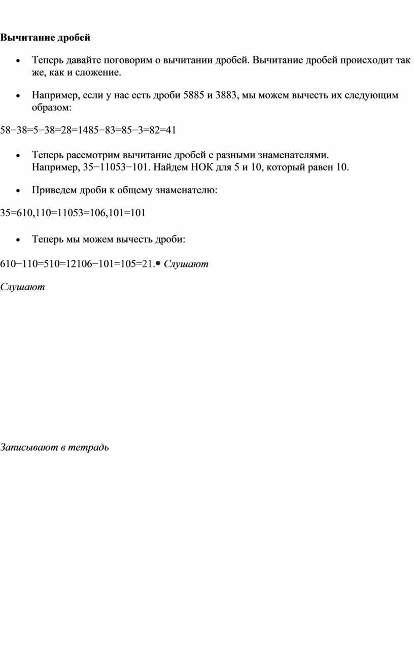 - Провести упражнения на вычитание дробей, как с одинаковыми, так и с разными знаменателями.