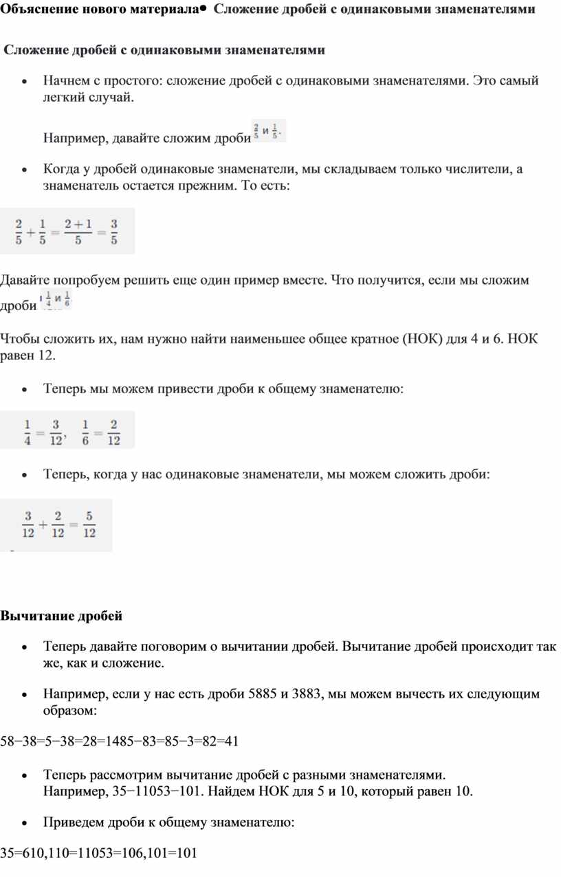 - Объяснить правила сложения и вычитания дробей с одинаковыми знаменателями.