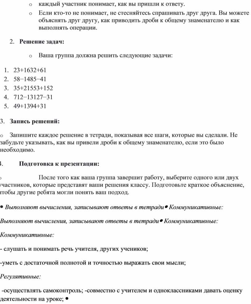 Я разделю вас на небольшие группы по 3-4 человека. Каждая группа получит набор задач на сложение и вычитание дробей. Ваша цель — решить все задачи и подготовить краткое объяснение каждого шага, чтобы потом представить результаты классу. Инструкции:1. Работа в группе: