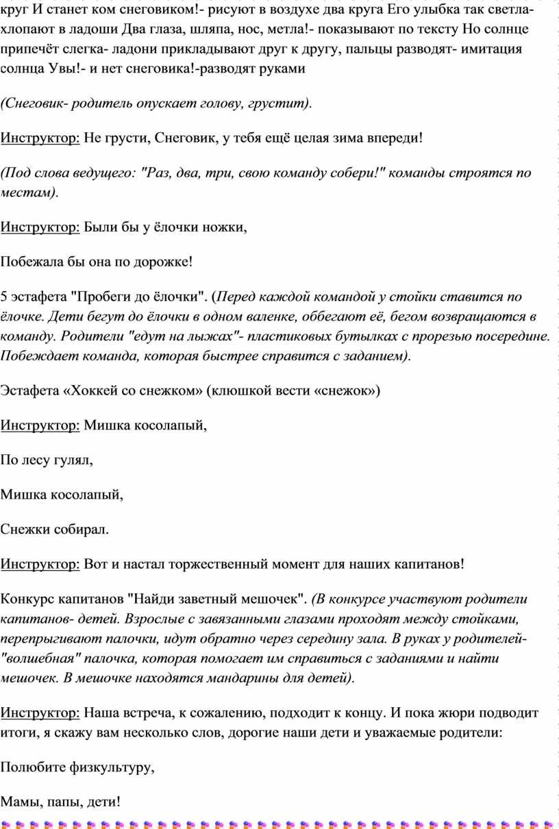 5 эстафета "Пробеги до ёлочки". (Перед каждой командой у стойки ставится по ёлочке. Дети бегут до ёлочки в одном валенке, оббегают её, бегом возвращаются в команду. Родители "едут на лыжах"- пластиковых бутылках с прорезью посередине. Побеждает команда, которая быстрее справится с заданием).