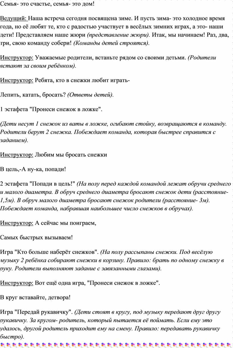 Ведущий: Наша встреча сегодня посвящена зиме. И пусть зима- это холодное время года, но её любят те, кто с радостью участвует в весёлых зимних играх, а это- наши дети! Представляем наше жюри (представление жюри). Итак, мы начинаем! Раз, два, три, свою команду собери! (Команды детей строятся).