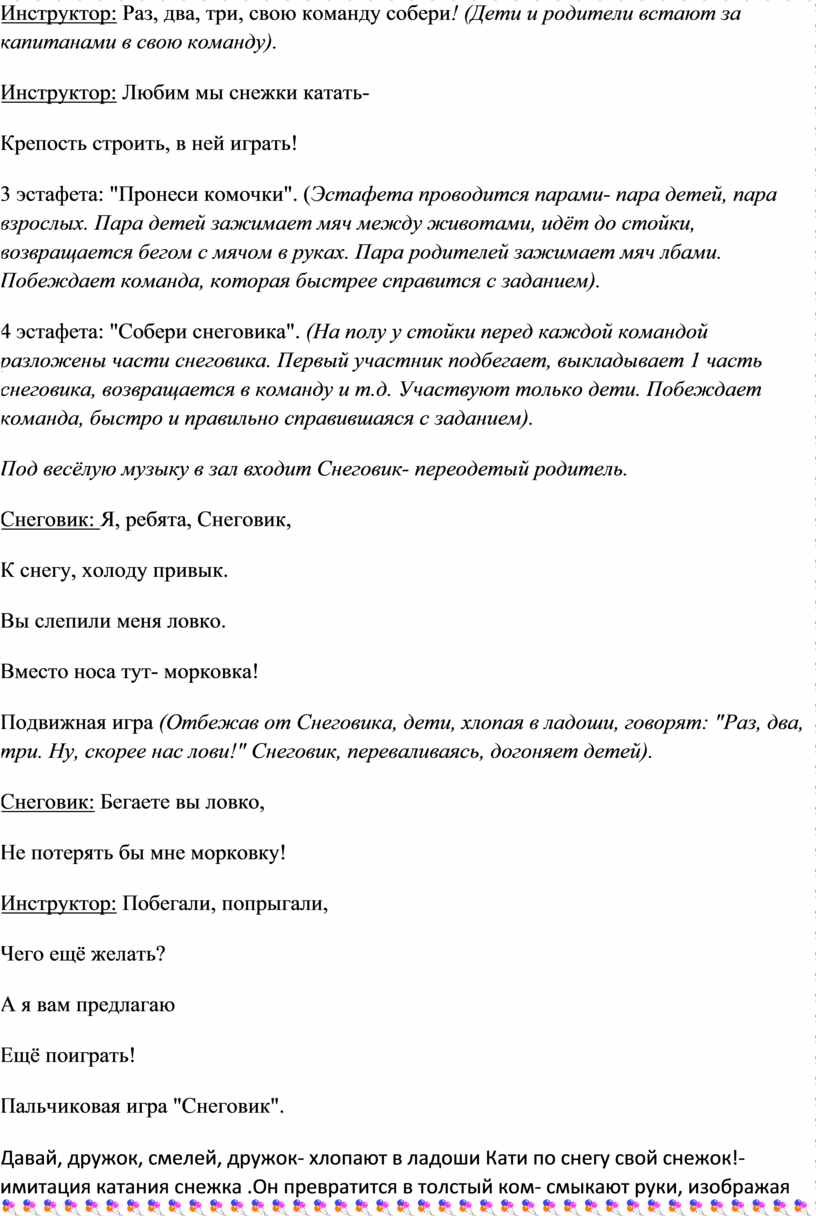 4 эстафета: "Собери снеговика". (На полу у стойки перед каждой командой разложены части снеговика. Первый участник подбегает, выкладывает 1 часть снеговика, возвращается в команду и т.д. Участвуют только дети. Побеждает команда, быстро и правильно справившаяся с заданием).