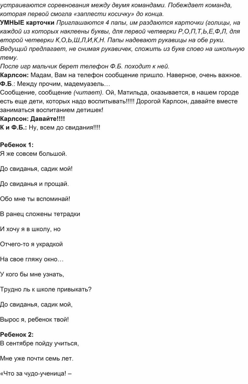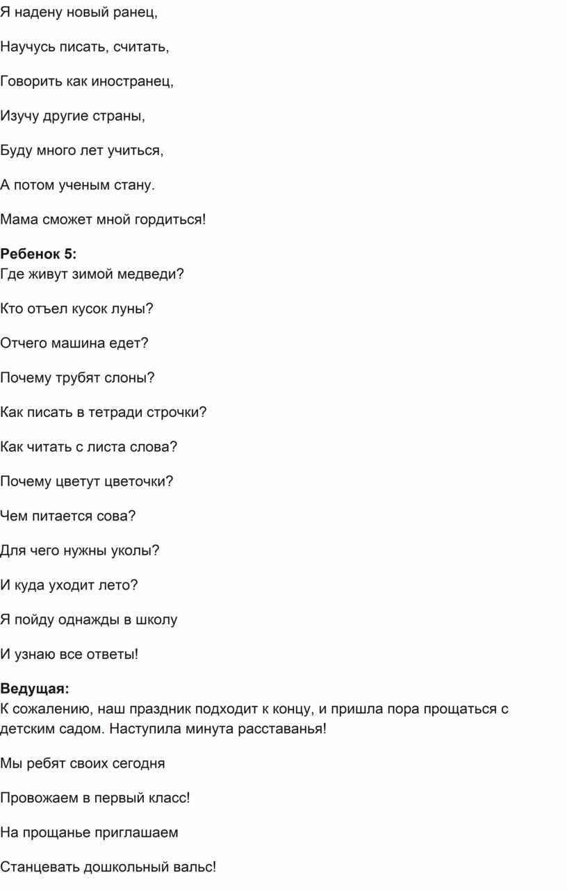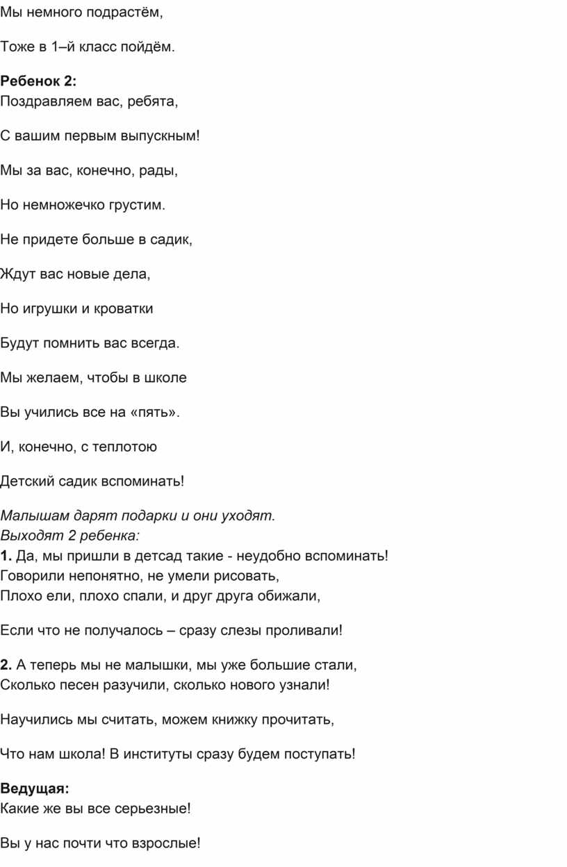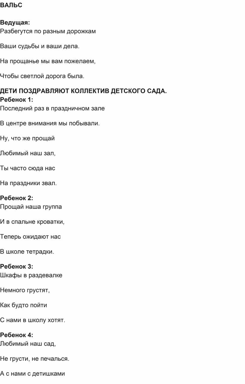 Ведущая: Здравствуйте, уважаемые гости и коллеги! Сегодня наш детский сад открыл двери для выпускного бала, посвященного будущим первоклассникам!