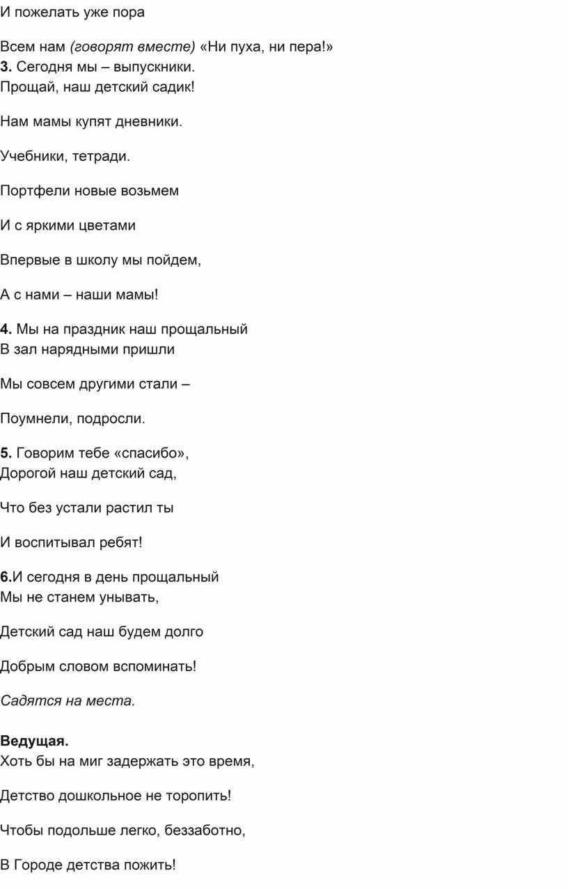 Какими же беспомощными, забавными малышами вы были! Мамы приводили вас за ручку, вы едва умели говорить. Кто-то плакал по утрам, кто-то держался за нянин халат или ходил «хвостиком» за воспитателем, кто-то просился на руки и не умел держать ложку в руках. И все вы долго стояли у окна и махали мамам вслед рукой, и своей маме, и чужой. Сегодня вы – самые старшие ребята в детском саду, а поздравить вас пришли самые маленькие жители Города детства.