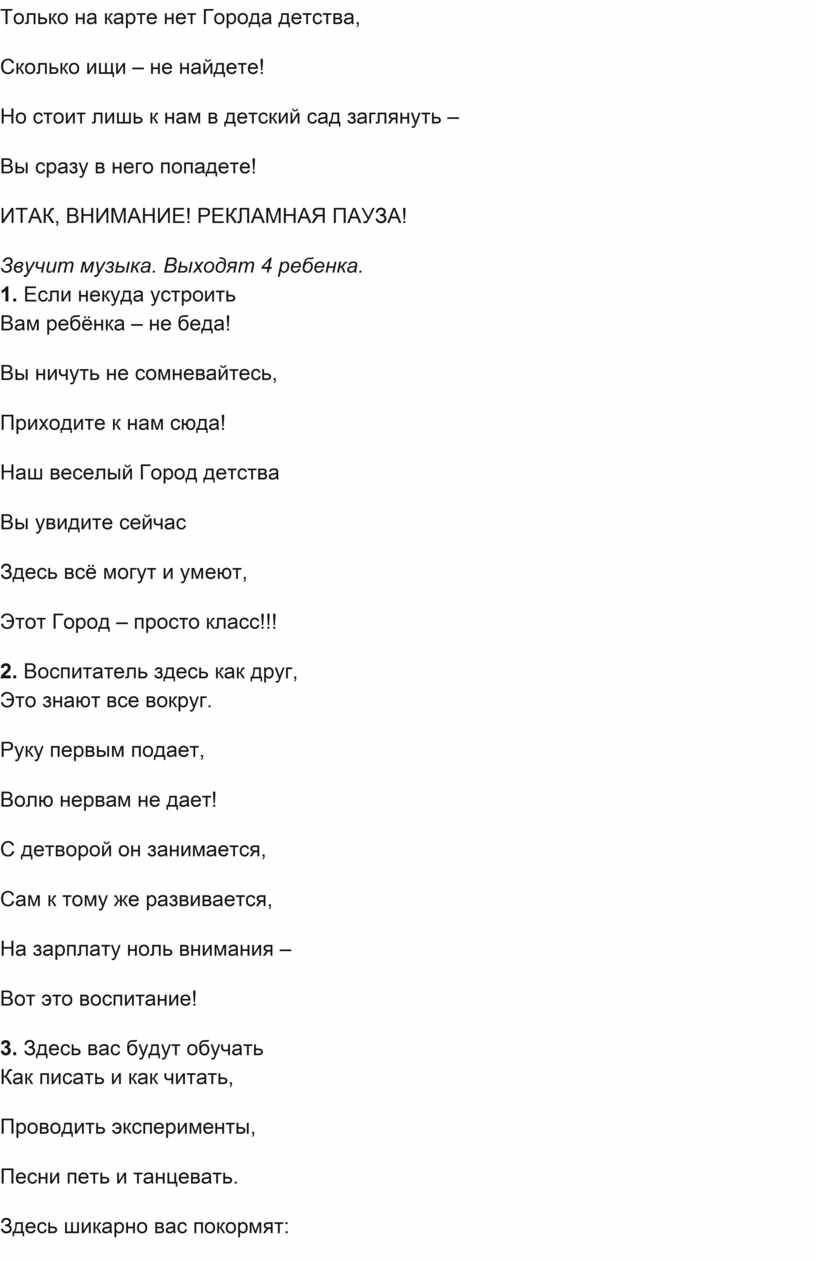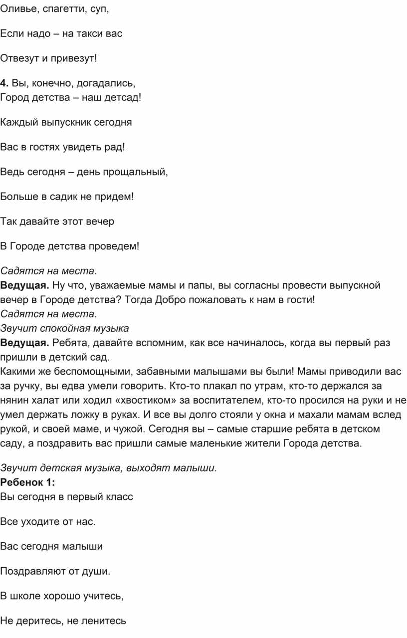 Ведущая. Ну что, уважаемые мамы и папы, вы согласны провести выпускной вечер в Городе детства? Тогда Добро пожаловать к нам в гости!