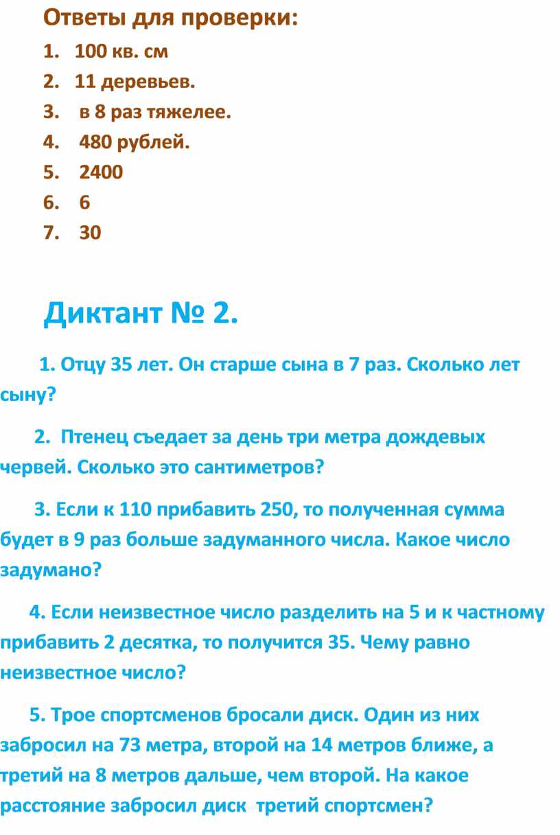 5. Число 400 повторить слагаемыми 8 раз. Полученное число уменьшить на произведение чисел 20 и 40. Какой ответ?