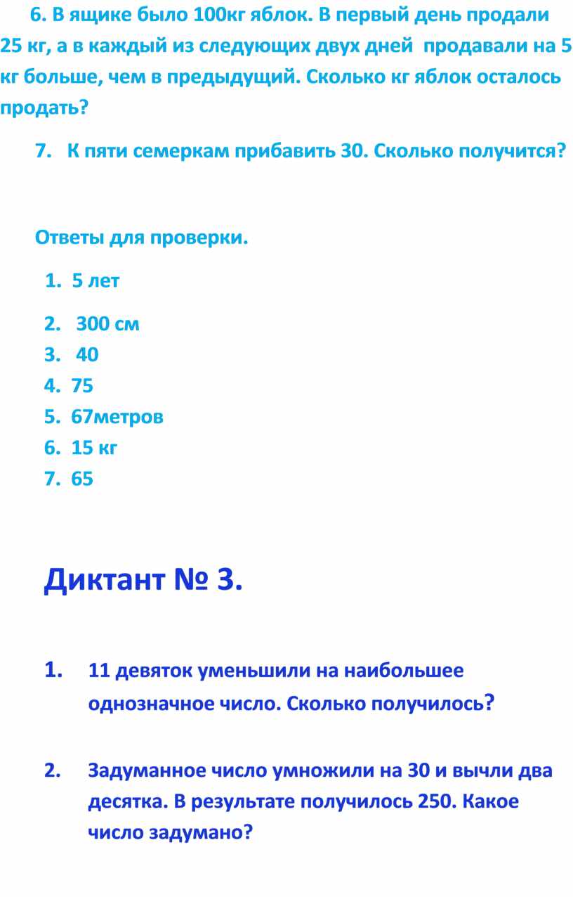 6. В ящике было 100кг яблок. В первый день продали 25 кг, а в каждый из следующих двух дней продавали на 5 кг больше, чем в предыдущий. Сколько кг яблок осталось продать?