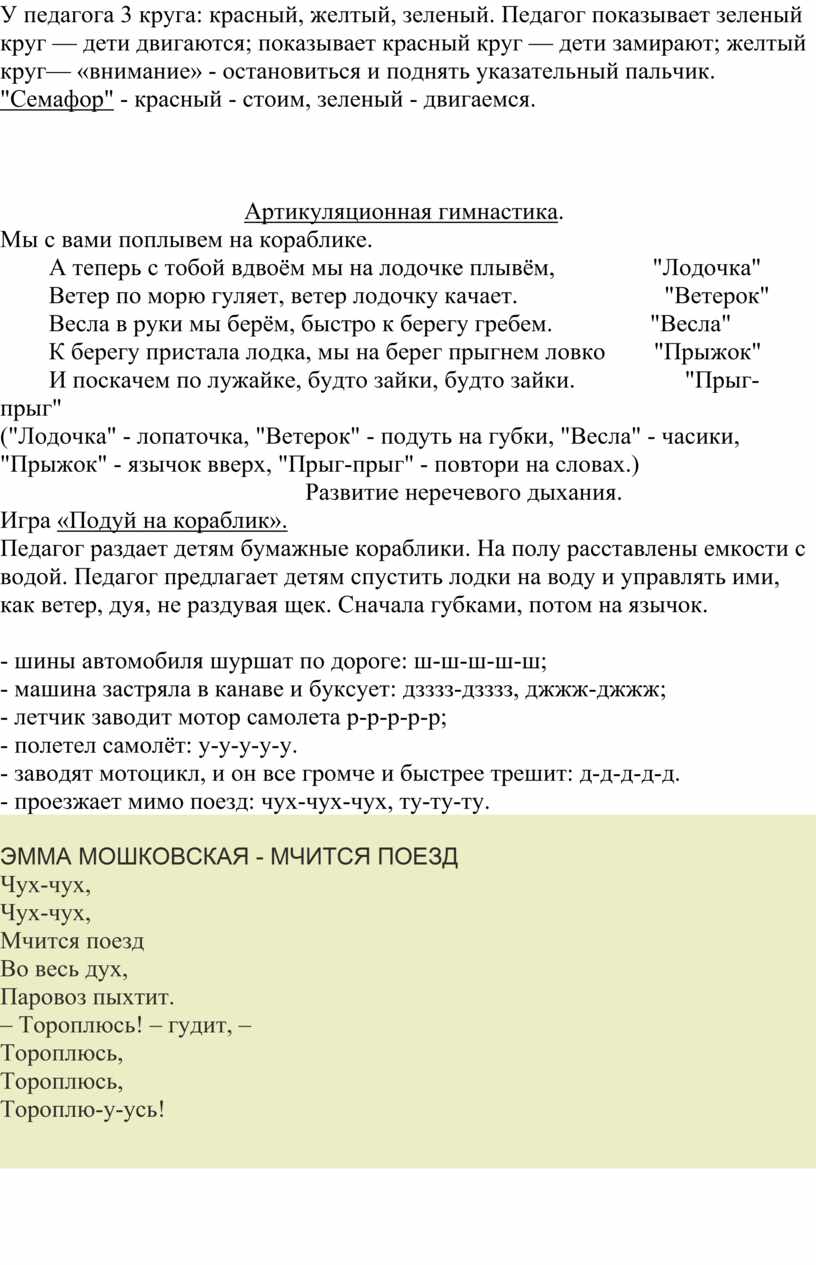 У педагога 3 круга: красный, желтый, зеленый. Педагог показывает зеленый круг — дети двигаются; показывает красный круг — дети замирают; желтый круг— «внимание» - остановиться и поднять указательный пальчик.