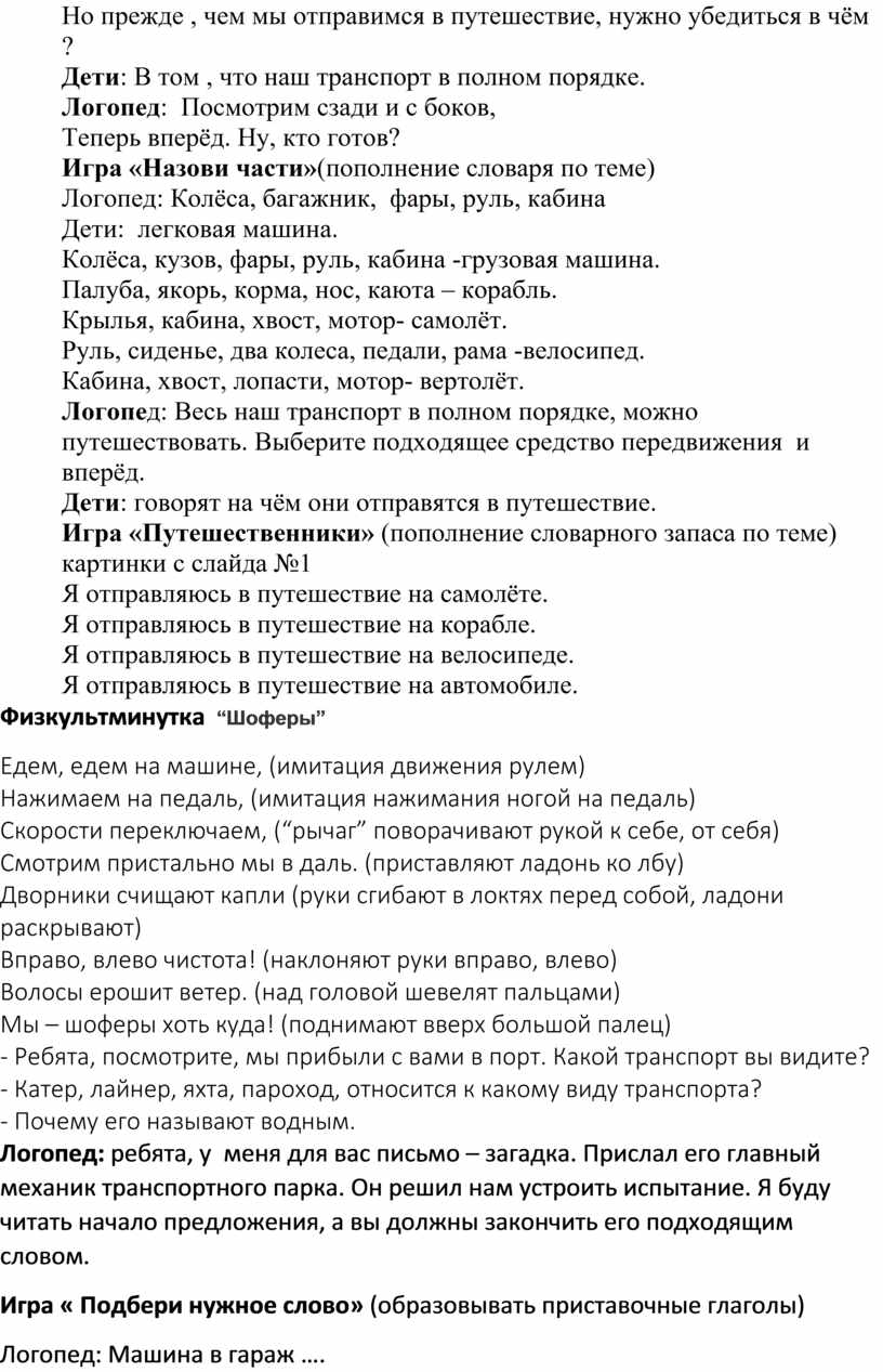 Логопед: Сегодня мы отправимся в путешествие (на доске картинки с изображением транспортных средств(слайд 1), дети рассказывают , что изображено).