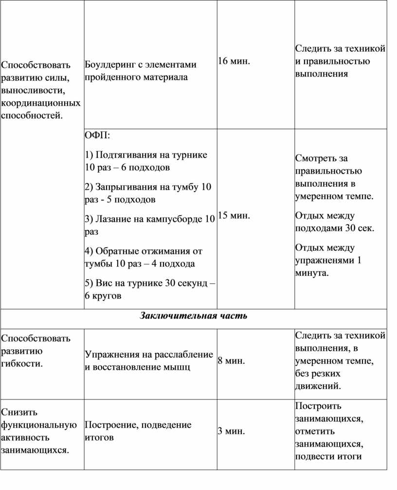 ОФП: 1) Подтягивания на турнике 10 раз – 6 подходов 2) Запрыгивания на тумбу 10 раз - 5 подходов 3) Лазание на кампусборде 10 раз 4) Обратные отжимания от тумбы 10 раз – 4 подхода 5) Вис на турнике 30 секунд – 6 кругов |