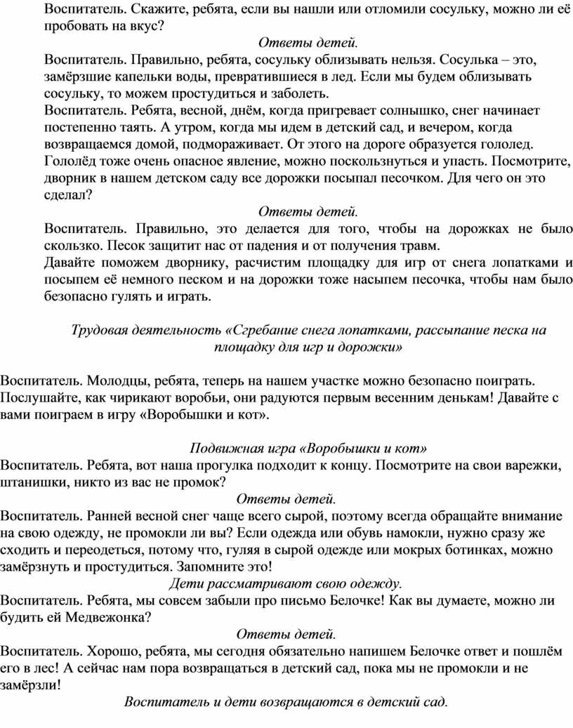Воспитатель. Правильно, ребята, сосульку облизывать нельзя. Сосулька – это, замёрзшие капельки воды, превратившиеся в лед. Если мы будем облизывать сосульку, то можем простудиться и заболеть.