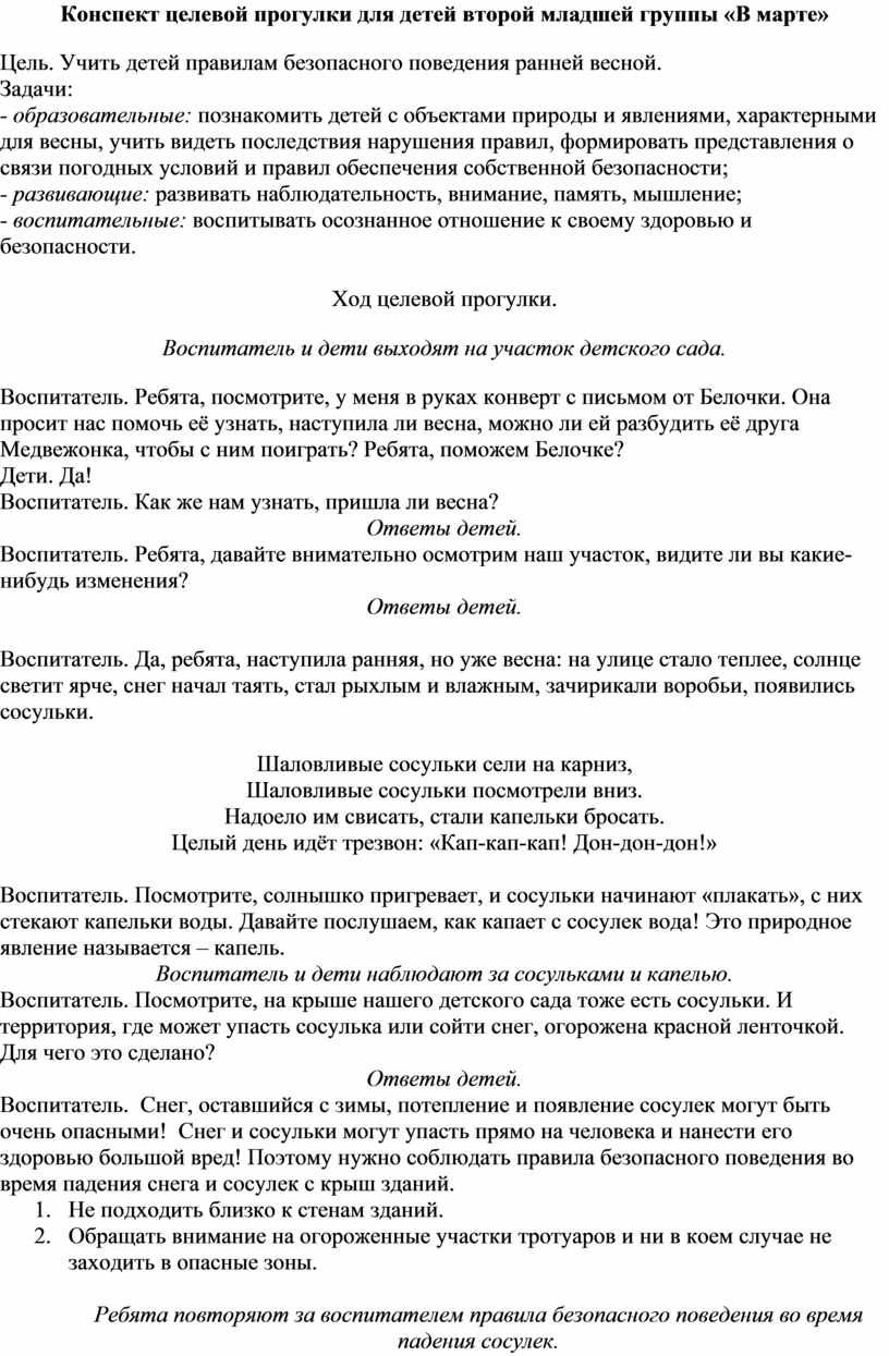 - образовательные: познакомить детей с объектами природы и явлениями, характерными для весны, учить видеть последствия нарушения правил, формировать представления о связи погодных условий и правил обеспечения собственной безопасности;