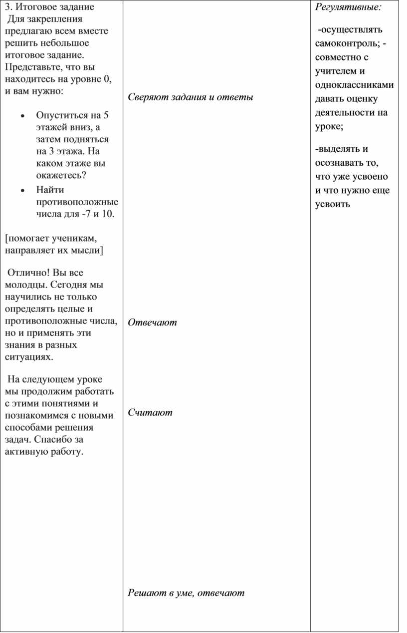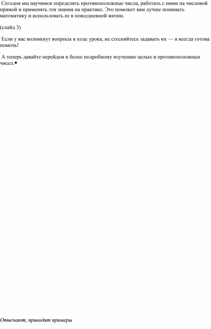 [помогает ученикам, направляет их мысли] Отлично! Вы все молодцы. Сегодня мы научились не только определять целые и противоположные числа, но и применять эти знания в разных ситуациях. На следующем уроке мы продолжим работать с этими понятиями и познакомимся с новыми способами решения задач. Спасибо за активную работу. |