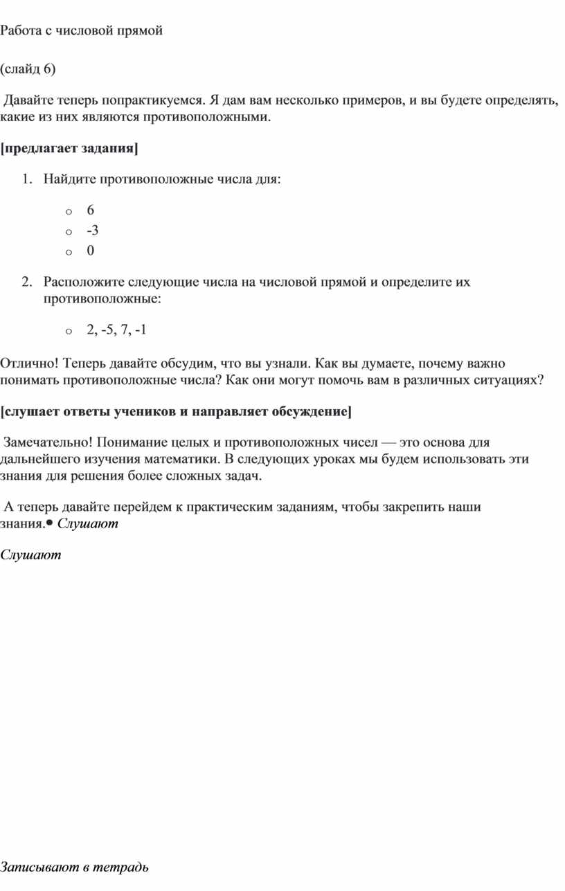 Отлично! Теперь давайте обсудим, что вы узнали. Как вы думаете, почему важно понимать противоположные числа? Как они могут помочь вам в различных ситуациях? [слушает ответы учеников и направляет обсуждение] Замечательно! Понимание целых и противоположных чисел — это основа для дальнейшего изучения математики. В следующих уроках мы будем использовать эти знания для решения более сложных задач. А теперь давайте перейдем к практическим заданиям, чтобы закрепить наши знания. |