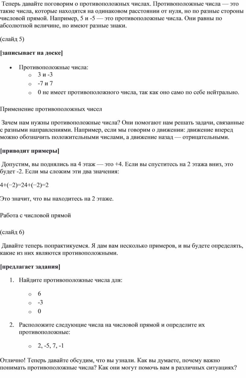 Итак, ребята, давайте углубимся в тему целых и противоположных чисел. Как я уже упоминала, целые числа включают в себя положительные числа, отрицательные числа и ноль. Это очень важная категория чисел, потому что они помогают нам описывать множество ситуаций в реальной жизни. (слайд 4) [рисует на доске числовую прямую и отмечает ноль, положительные и отрицательные числа] Посмотрите на эту числовую прямую. Здесь мы видим, что числа расположены в порядке возрастания. Слева от нуля находятся отрицательные числа, а справа — положительные. Это помогает нам визуализировать, как числа соотносятся друг с другом. Определение противоположных чиселТеперь давайте поговорим о противоположных числах. Противоположные числа — это такие числа, которые находятся на одинаковом расстоянии от нуля, но по разные стороны числовой прямой. Например, 5 и -5 — это противоположные числа. Они равны по абсолютной величине, но имеют разные знаки. (слайд 5) [записывает на доске]