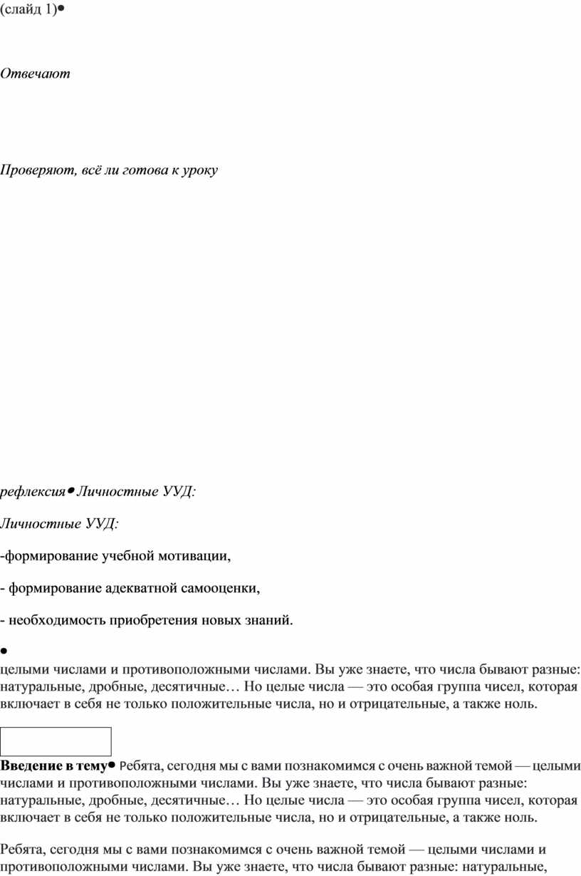 Конспект урока по математике «Целые числа. Противоположные числа»,