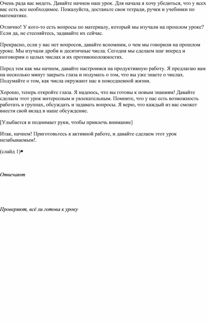 Доброе утро, ребята! Как вы сегодня? [Ждет ответ от учеников] Очень рада вас видеть. Давайте начнем наш урок. Для начала я хочу убедиться, что у всех вас есть все необходимое. Пожалуйста, достаньте свои тетради, ручки и учебники по математике. Отлично! У кого-то есть вопросы по материалу, который мы изучали на прошлом уроке? Если да, не стесняйтесь, задавайте их сейчас. Прекрасно, если у вас нет вопросов, давайте вспомним, о чем мы говорили на прошлом уроке. Мы изучали дроби и десятичные числа. Сегодня мы сделаем шаг вперед и поговорим о целых числах и их противоположностях. Перед тем как мы начнем, давайте настроимся на продуктивную работу. Я предлагаю вам на несколько минут закрыть глаза и подумать о том, что вы уже знаете о числах. Подумайте о том, как числа окружают нас в повседневной жизни. Хорошо, теперь откройте глаза. Я надеюсь, что вы готовы к новым знаниям! Давайте сделаем этот урок интересным и увлекательным. Помните, что у нас есть возможность работать в группах, обсуждать и задавать вопросы. Я верю, что каждый из вас сможет внести свой вклад в наше обсуждение. [Улыбается и поднимает руки, чтобы привлечь внимание] Итак, начнем! Приготовьтесь к активной работе, и давайте сделаем этот урок незабываемым!. (слайд 1) |