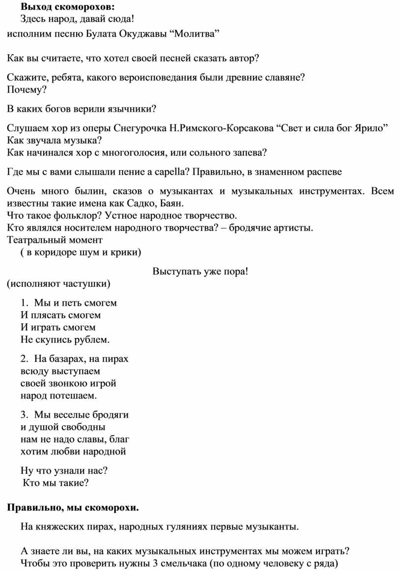 Музыкальный материал: “Да исправится молитва моя” П.Чесноков, “Молитва” Б.Окуджава, “Знаменный распев”, “Свете тихий” Киевский распев, хор “Свет и сила бог Ярило” Н.Римский-Корсаков, “Во кузнице” РНП, Частушки скоморохов.