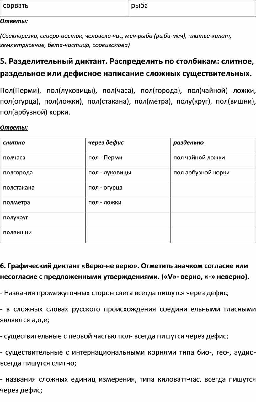 5. Разделительный диктант. Распределить по столбикам: слитное, раздельное или дефисное написание сложных существительных.