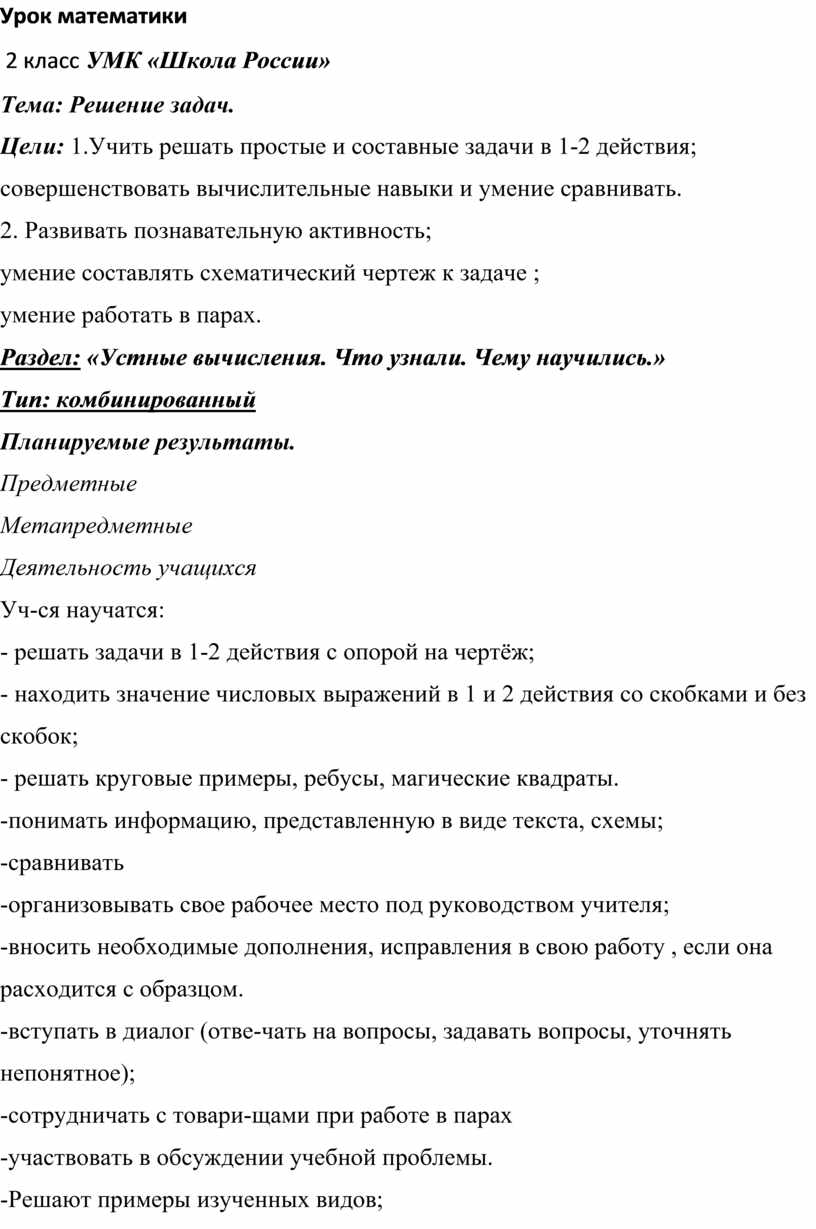 - решать задачи в 1-2 действия с опорой на чертёж;