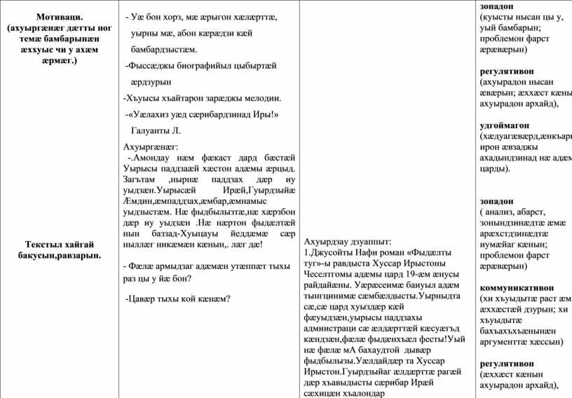 Предметон: текстæн йæ сæйраг хъуыды сбæрæг кæнын, анализ скæнын.. Метапредметон: уацмысы сæйраг хъайтарты архайд, сæ хъуыдтæгтæн аргъ кæнын; бамбарын кæнын урочы нысан , æвзарын раст аналитикон нысан, хынцинæгтæ, кæрæдзимæ раст фæрстытæ дæттын, кæрæдзийы хъуыдытæм лæмбынæг хъусын æмæ коммуникативон уæвын. Удгоймагон: лæгдзинады æууæлтыл æрдзурын, удыхъæды хорз миниуджытæ рæзын кæнын; тырнын ныхасы хъæздыгдзинадмæ. |
