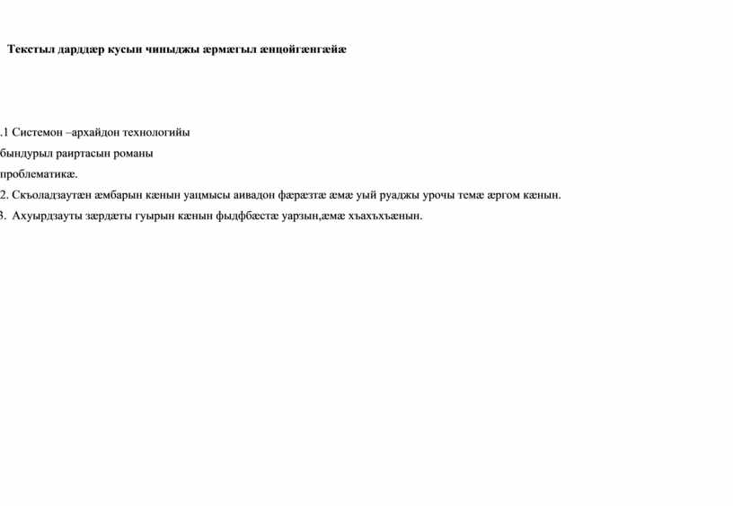 1. Раиртасын романы проблематикæ. 2.Романы историон бындурыл æрдзурын. 3.Уацмысы идейæ æххæстæй раргом кæнын. 4.Архайджыты фæлгæцтæн характесисткæ скнын. |