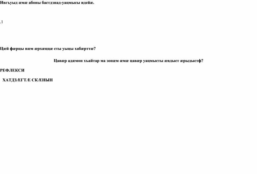 1. Ирыстоны æфхæрджытæ. 2.Нæ фыдæлты удыхъæд. 3.Хъайтарон зарæджы нысаниуæг ивгъуыдæй абонмæ. 4.Национ иудзинад романы. Роман даррдæр кæсын. Ныффыссын нывæцæн ;Мæ Ир,дæ цæфтæ байгас уæнт æнустæм! «Фыдæлты туг»-мæ гæсгæ.