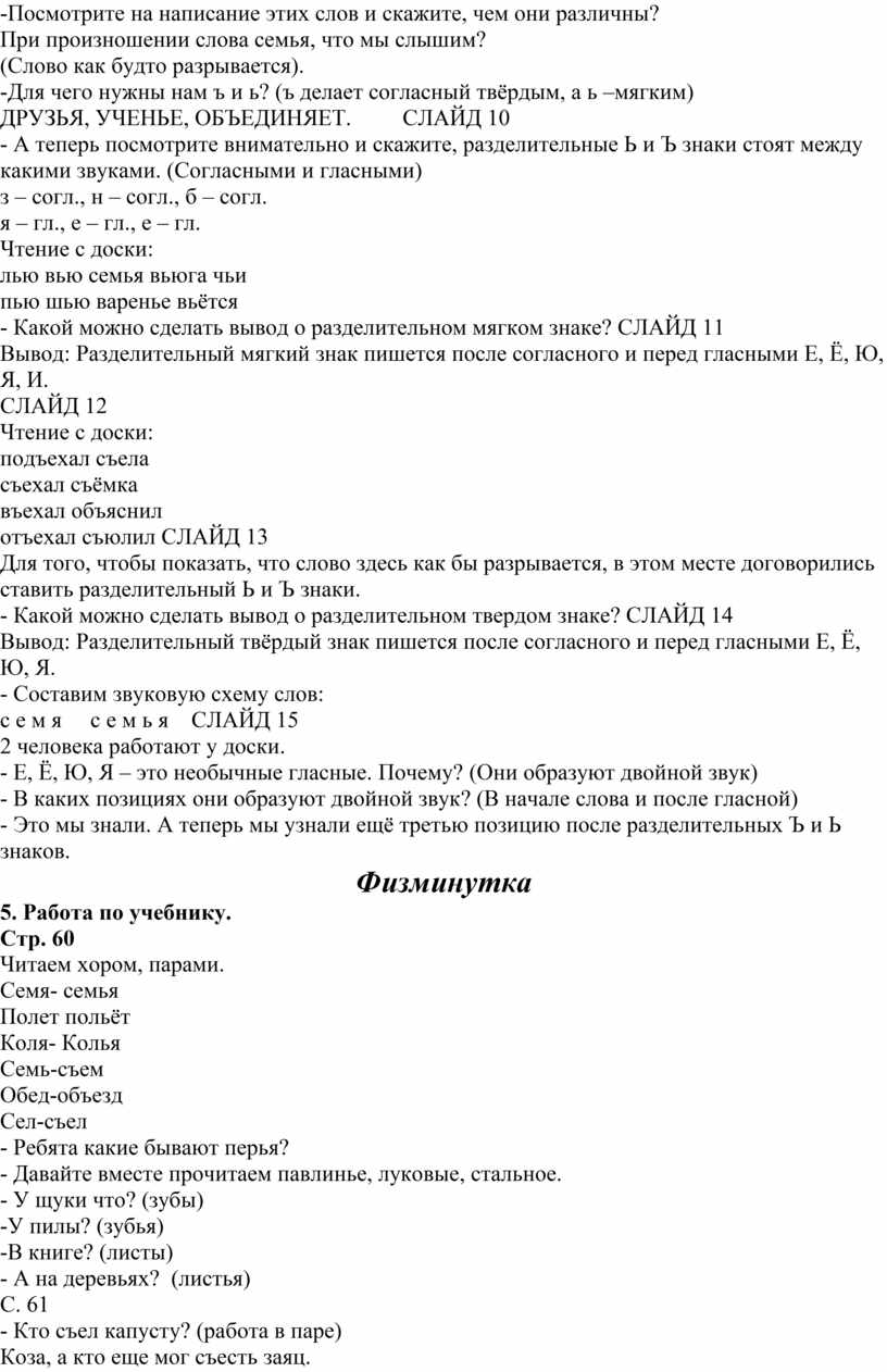 - А теперь посмотрите внимательно и скажите, разделительные Ь и Ъ знаки стоят между какими звуками. (Согласными и гласными)