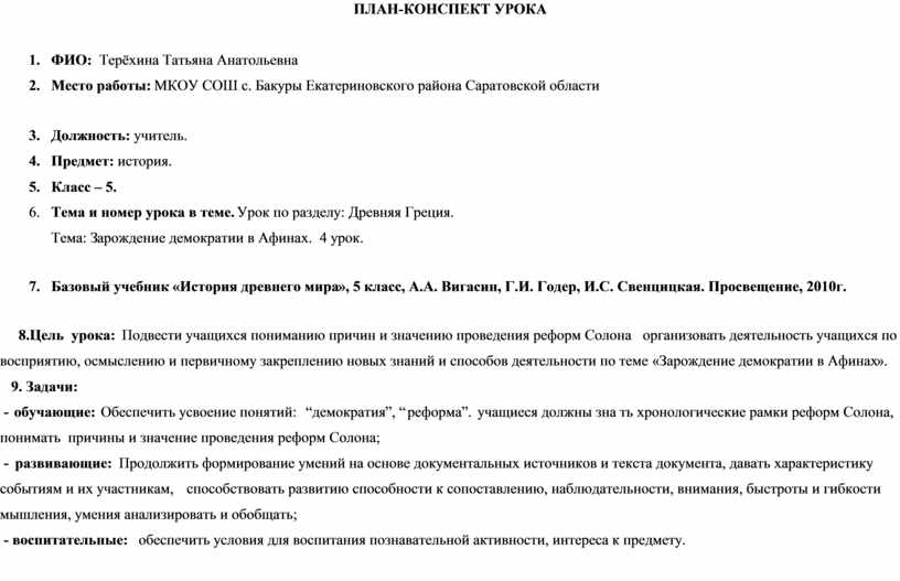 - обучающие: Обеспечить усвоение понятий: “демократия”, “реформа”. учащиеся должны знать хронологические рамки реформ Солона, понимать причины и значение проведения реформ Солона;