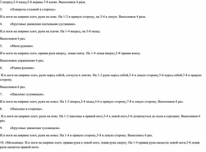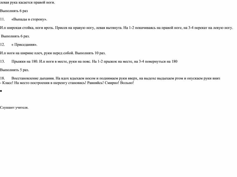 Перед тем, как выполнять упражнения новые, то нужно для начала что сделать? Верно. Учитель дает команды, -“Равняйсь”, -“Смирно”. Дети выполняют строевое упражнения. -«Налево», -«Кругом», -«Налево», -«Направо» и «Направо!», « В обход по залу шагом «Марш! 1 круг», ходьба на носках пол круга, (руки на пояс, спина прямая, тянемся вверх). на пятках пол круга; на внешней стороне стопы пол круга; на внутренней стороне стопы пол круга. «Бегом, марш!» (2 круга) - Выполняем в умеренном темпе, не обгоняем друг друга, не толкаем друг друга. «Класс шагом марш!» «На раз поднимаем руки вверх, делаем глубокий вдох, на 2 опускаем руки вниз и выдыхаем» «Направляющий к месту построения шагом, марш. Левой-левой, раз, два, три, Левой-левой, раз, два три. - Стой! Раз, два! Нале-Во! Раз, два!» «Класс равняйсь, смирно! На 1, 2, 3, рассчитайсь!» 1 номера на месте! 2 номера 2 шага вперёд Марш! (производит счёт 1-2) 3 номера 3 шага вперёд Марш! (производит счёт 1-2-3). Учитель под счет совместно с детьми выполняет комплекс ОРУ: КОМПЛЕКС ОРУ 1. «Круговые движения головой». И.п ноги на ширине плеч, руки на поясе. На 1-4 в правую сторону на 5-8 в левую. Выполнять 4 раза. 2. «Наклоны головой». И.п ноги на ширине плеч, руки на пояс. На 1-2 вперед,3-4 назад,5-6 вправо,7-8 влево. Выполняем 4 раза. 3. «Повороты головой в сторону». И.п ноги на ширине плеч, руки на пояс. На 1-2 в правую сторону, на 3-4 в левую. Выполняем 4 раза. 4. «Круговые движения плечевыми суставами». И.п ноги на ширине плеч, руки на плечи. На 1-4 вперед, на 5-8 назад. Выполняем 6 раз. 5. «Махи руками». И.п ноги на ширине плеч, правая рука вверху, левая снизу. На 1-4 левая вверху,5-8 правая внизу. Выполняем упражнение 6 раз. 6. «Рывки руками». И.п ноги на ширине плеч, руки перед собой, согнуты в локтях. На 1-2 руки перед собой,3-4 в левую сторону,5-6 перед собой,7-8 в правую сторону. Выполняем 6 раз. 7. «Наклоны туловищем». И.п ноги на ширине плеч, руки на поясе. На 1-2 вперед,3-4 назад,5-6 в правую сторону,7-8 в левую сторону, Выполняем 6 раз. 8. «Наклоны в стороны». И.п ноги на ширине плеч, руки на пояс. На 1-2 наклоны к правой ноге,3-4 к левой ноге,5-6 дотронуться до пола в середине. Выполняем 6 раз. 9. «Круговые движения туловищем». И.п ноги на ширине плеч, руки на поясе. На 1-4 в правую сторону,5-8 в левую сторону. Выполнять 6 раз. 10. «Мельница». И.п ноги на ширине плеч, правая рука к левой ноге, левая рука сверху. На 1-4 правая рука касается левой ноги,5-8 левая рука касается правой ноги. Выполнять 6 раз 11. «Выпады в сторону». И.п широкая стойка, ноги врозь. Присев на правую ногу, левая вытянута. На 1-2 покачиваясь на правой ноге, на 3-4 перекат на левую ногу. Выполнять 6 раз. 12. « Приседания». И.п ноги на ширине плеч, руки перед собой. Выполнять 10 раз. 13. Прыжки на 180. И.п ноги в месте, руки на пояс. На 1-2 прыжок на месте, на 3-4 повернуться на 180 Выполнить 5 раз. 18. Восстановление дыхания. На вдох вдыхаем носом и поднимаем руки вверх, на выдохе выдыхаем ртом и опускаем руки вниз - Класс! На место построения в шеренгу становись! Равняйсь! Смирно! Вольно!
