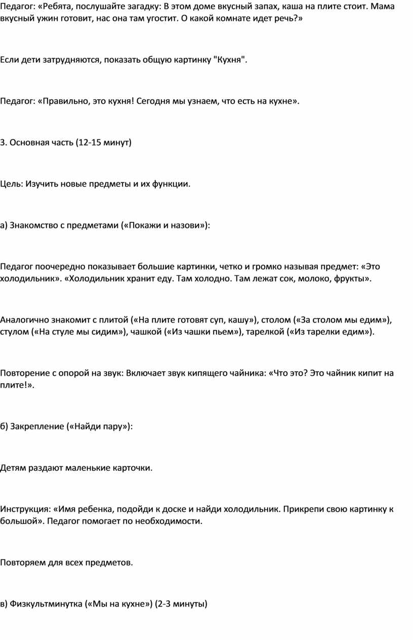 2. Раздаточный материал: Маленькие карточки-дубликаты больших картинок для каждого ребенка. Простые пазлы из 2-4 частей с изображением кухонных предметов.